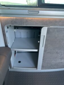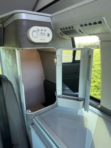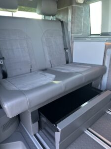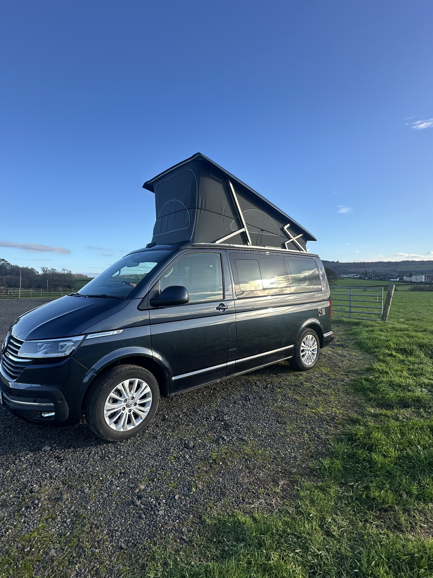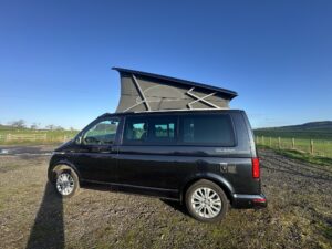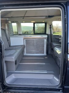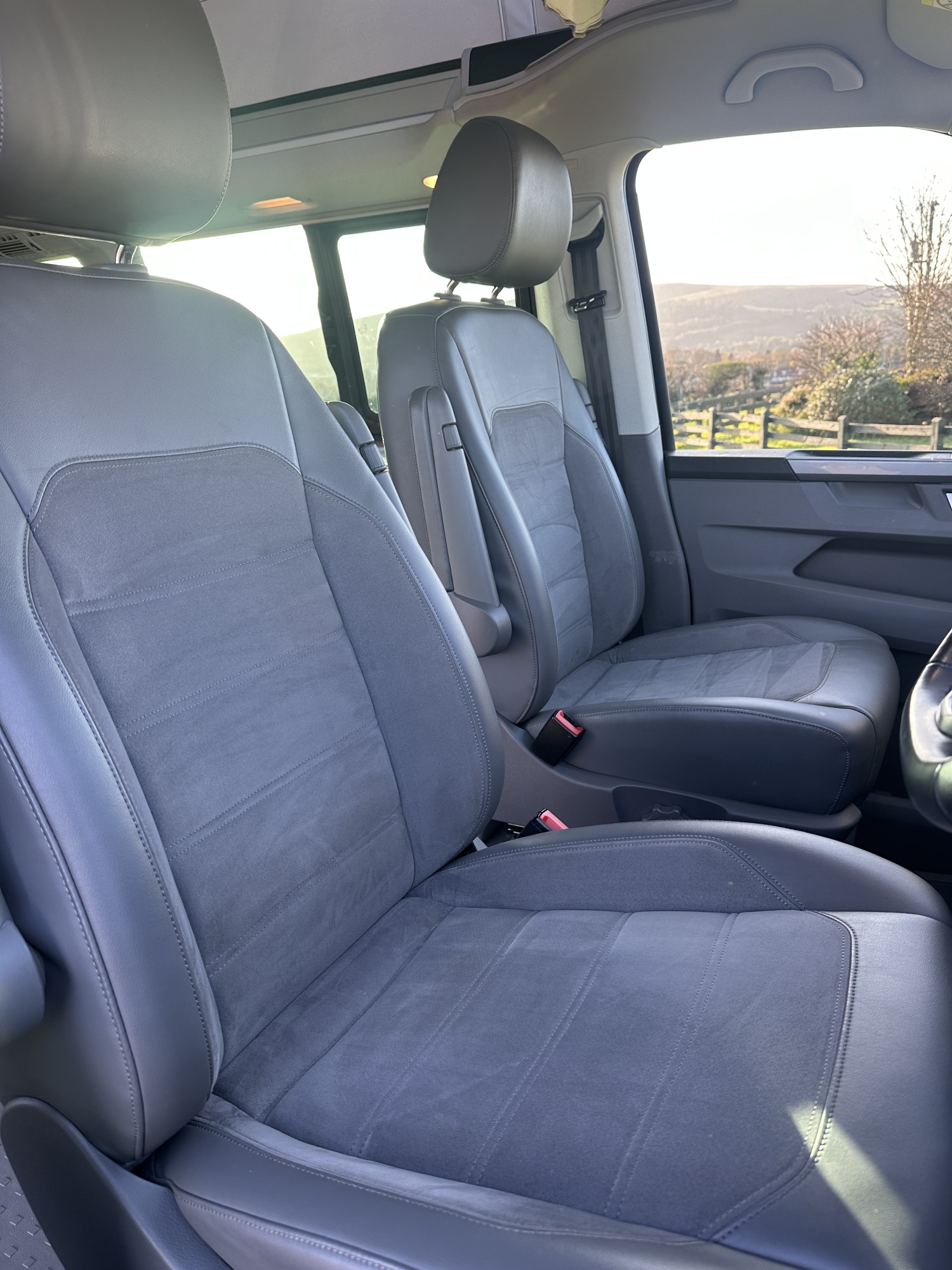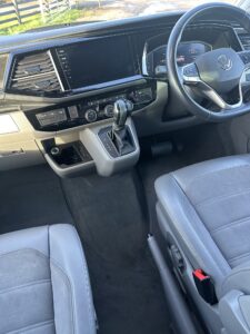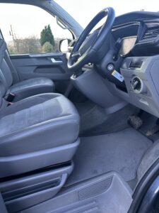 High specification VW T6.1 California Ocean in Starlight Blue with VW additional upgraded art velour seats and sat nav pro media plus full VW service history and manufacturers warranty to March 2027. Meticulously maintained, the worktops and shelves are as new with brand and brand new side magnetic blinds.