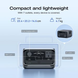 • High Power up to 1200W: RIVER 3 Plus powers appliances up to 1200W with X-Boost and provides 600W steady output. It features 7 outlets—3 UPS AC, 2 USB-A, USB-C, and car output—powering 90% of home devices. A built-in light ensures visibility anytime.