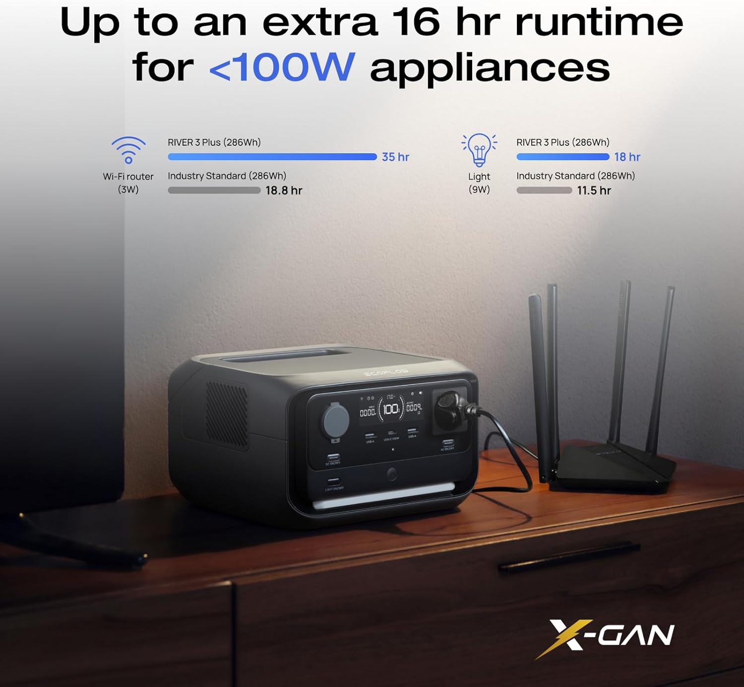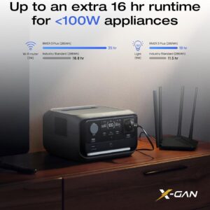 • Extra 16 hr Runtime & Ultra-Quiet: X-GaNPower boosts efficiency, delivering 16 hr runtime for <100W devices like lights and routers. Compact and ultra-quiet at 30 dB, it runs silently even at 0.5 m away.