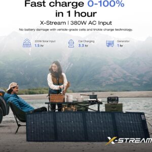 • Fast, Safe Charging Options: X-Stream tech recharges from 0-100% in 1 hr with no damage. Use 220W solar input for green, renewable energy in as fast as 1.5 hr, making it an efficient solar generator.