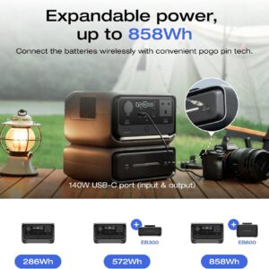• Expandable Power, Easy to Use: Expand capacity up to 858Wh with EB300 (286Wh) or EB600 (572Wh). Pogo Pin technology ensures seamless, wireless attachment. An extra battery adds a 140W USB-C port for more input/output options.